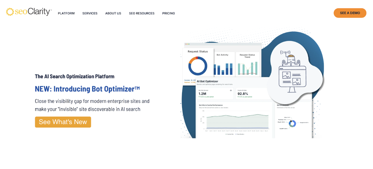 seoClarity is an enterprise SEO platform that includes AI visibility tracking for generative search systems such as ChatGPT, Gemini, and Google AI Overviews. The platform provides prompt exploration, sentiment detection, and share-of-voice style metrics showing how brands appear within AI-generated answers. Its AI monitoring features connect generative answer visibility with broader SEO datasets such as keyword rankings, site performance, and content optimization workflows.