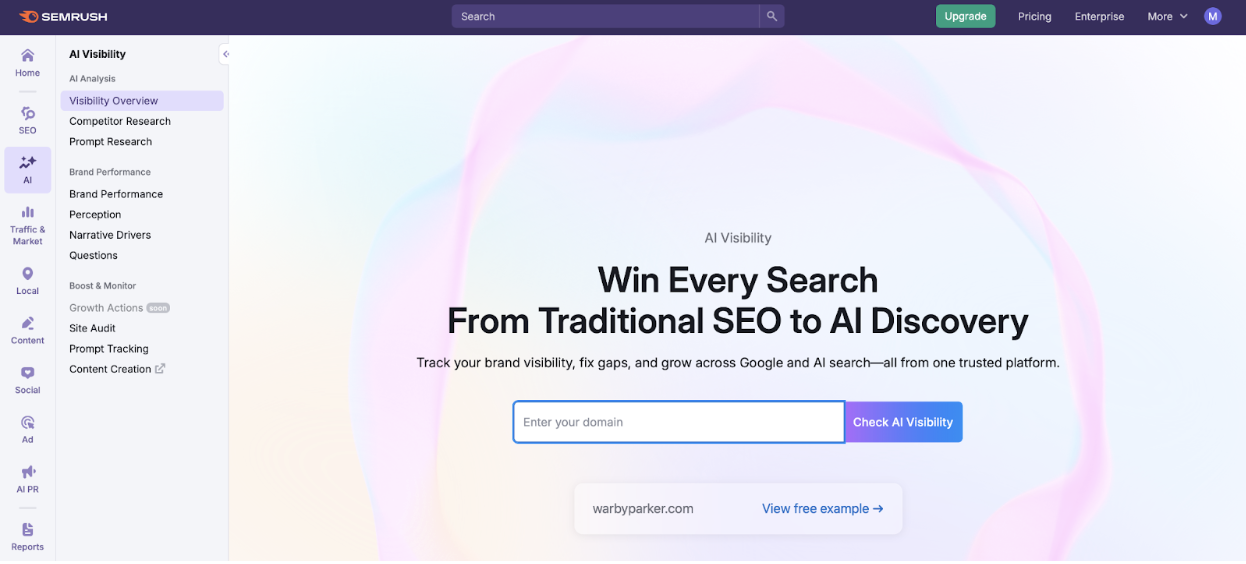 | 4 | Semrush (AI Visibility Toolkit) | AI visibility metrics integrated with SEO data and competitive analysis | Google AI Mode, Google AI Overviews | Tracks brand mentions and cited URLs in AI Mode |