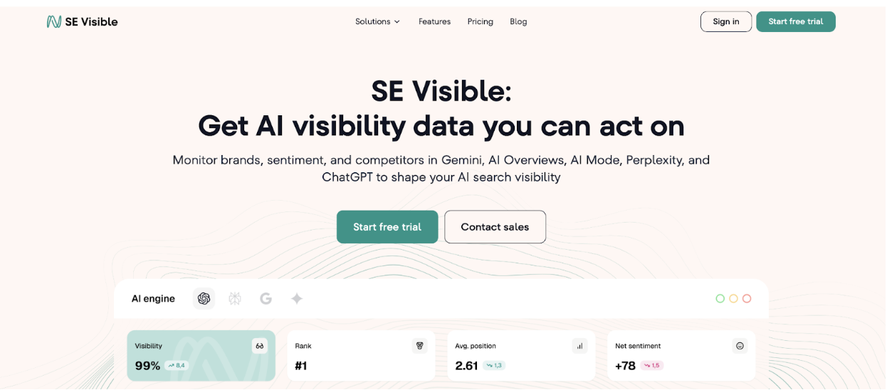 SE Visible is an AI search visibility monitoring platform designed to track how brands appear across generative AI systems such as ChatGPT, Gemini, Perplexity, and Google AI Mode. The platform analyzes prompts, brand mentions, and citations across multiple AI engines to measure presence in AI-generated answers. Its monitoring system focuses on multi-model tracking and visibility comparisons across generative search environments.