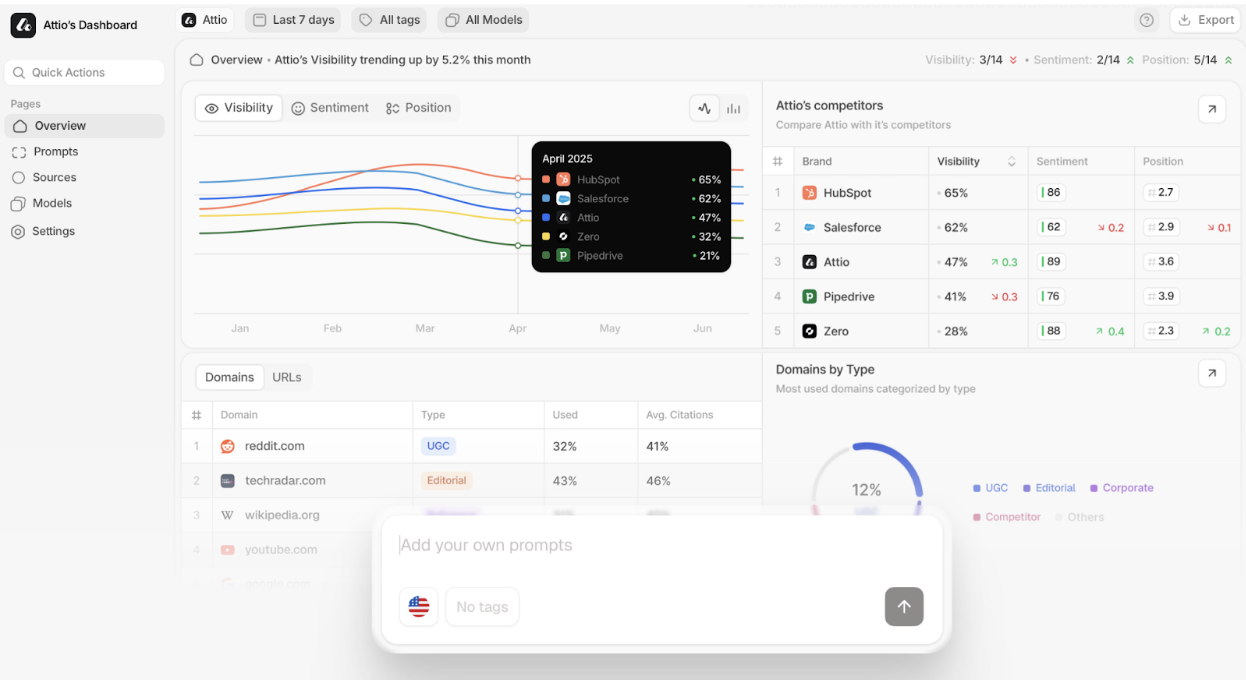 - Prompt discovery showing where a brand appears, where competitors appear, and where gaps exist