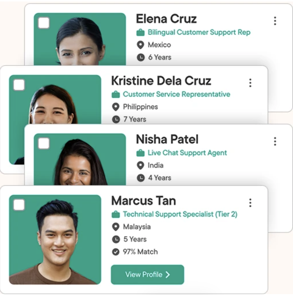AI-Powered Talent Matching:  1840’s proprietary Talent Cloud combines artificial intelligence with human vetting to match candidates by industry experience, tool stack familiarity (Zendesk, Salesforce, HubSpot, Intercom, etc.), and role-specific complexity. This reduces ramp time and improves productivity from day one.