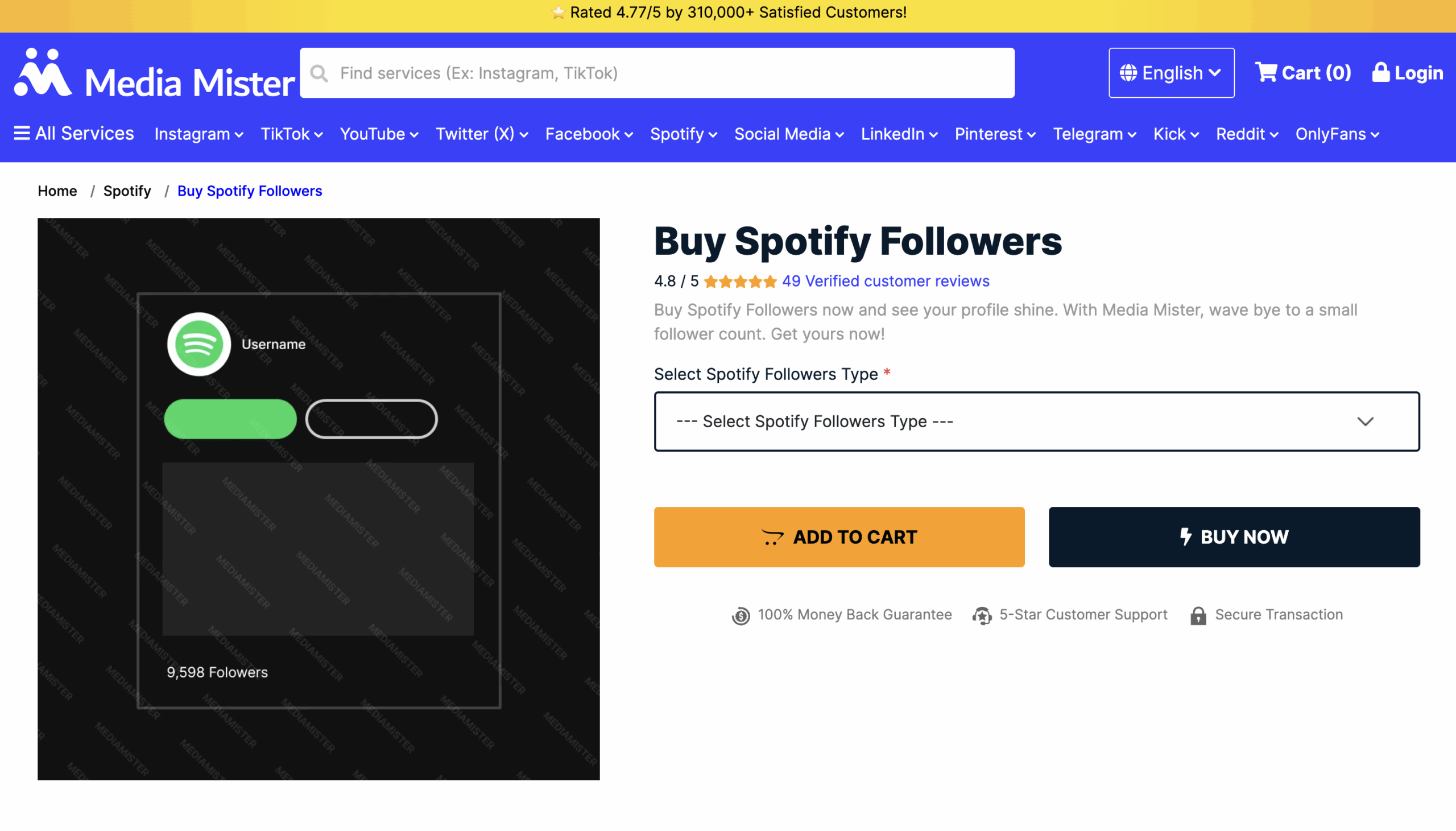 Media Mister also provides a 30-day refund guarantee if expectations aren’t met. Customer support is available through ticket and live chat systems. Along with followers, they offer related Spotify services like plays and monthly listeners, creating an all-in-one promotion solution.