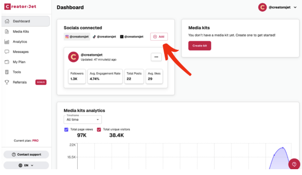 From there, users can add their social media profiles, which then appear directly inside the media kit. Using CreatorsJet’s own socials as an example, this step automatically displays platform information and public metrics.