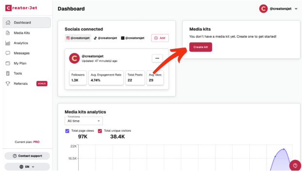 Once social profiles are connected, creating a media kit is straightforward. Each media kit is a live page hosted by CreatorsJet.