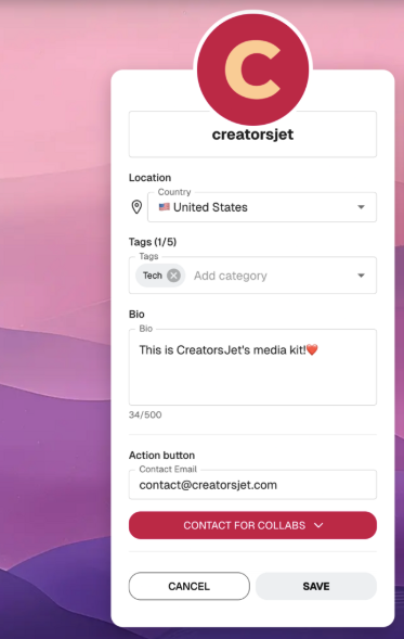 The profile section is where creators set the basic context of their media kit. It includes practical information such as location, category tags, a short bio, and a contact action.