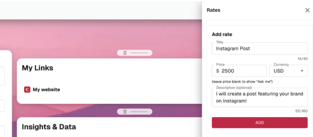 Rates are optional, but when included, they help set expectations early and reduce unnecessary conversations with brands that are not aligned on budget.