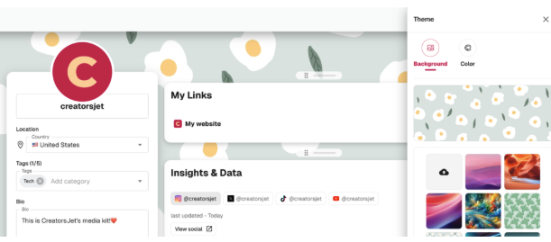 CreatorsJet allows creators to customize the visual theme of their media kit by choosing background styles and colour options. The goal is not full design control, but simple visual adjustments that help the kit feel aligned with a creator’s identity.