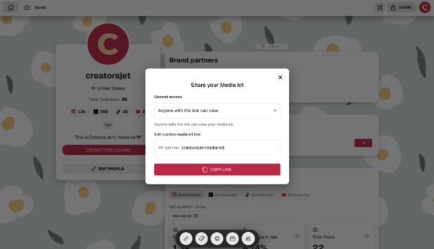 - The media kit lives on a single link that can be shared anywhere, making brand conversations simpler.
