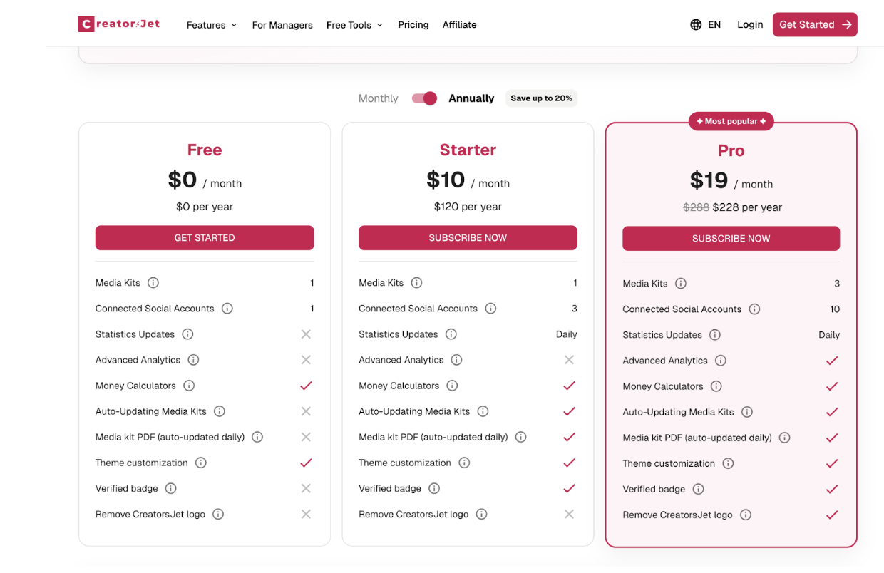 CreatorsJet uses a tiered pricing model so creators can choose a plan based on how actively they work with brands.