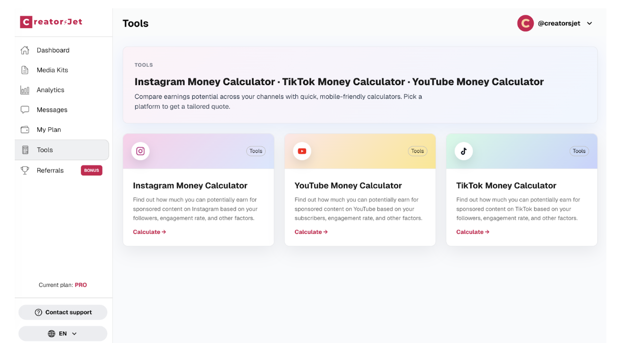 In addition to media kits, CreatorsJet provides three free tools that many creators find useful.