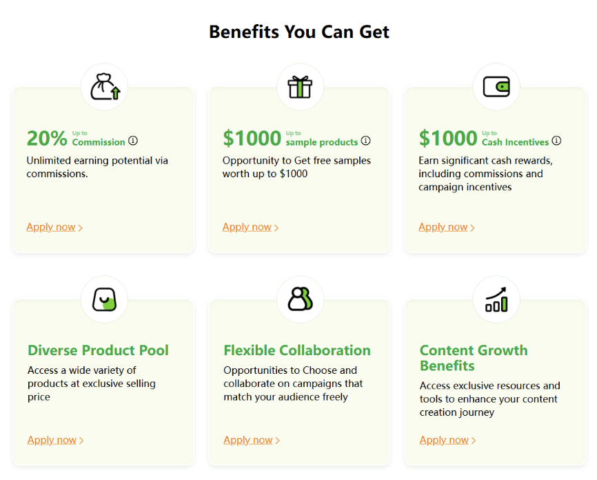 To expand its reach, Temu launched the Temu Influencer Program—its official creator partnership initiative. As a Temu Influencer, you can receive free product samples from Temu, earn up to 20% commission, and get exclusive opportunities for sponsored promotions and boosting options. Top-performing creators may also enjoy priority access to exposure on official Temu channels. Moreover, the program includes a secondary referral system that rewards creators for inviting others to join.