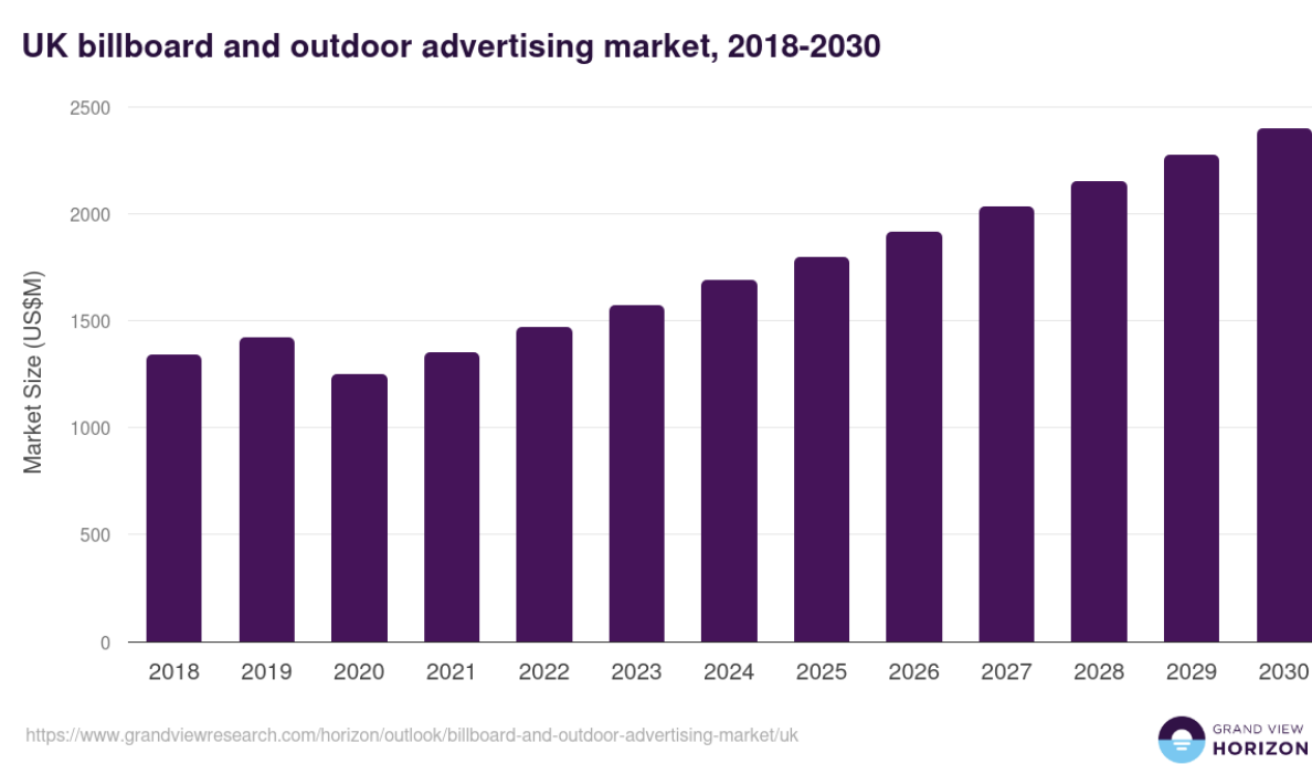 According to Grand View Research, following a decline in 2020, the UK outdoor advertising market experienced linear growth from 2018 to 2030, picking up speed in 2025 and 2030.