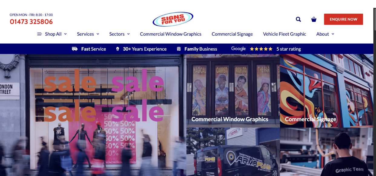 Services include: shop fascias, illuminated boards, banner printing, vehicle graphics, A-boards, and window vinyl.