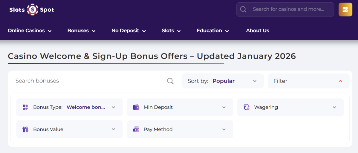 SlotsSpot includes around 4,000 bonus offers and tens of thousands of free slot games, while the focus remains on clear and usable information. The platform does not cover sportsbook offers or advanced filtering, but it provides casino players with a clearer view of bonus terms such as wagering rules and game restrictions.