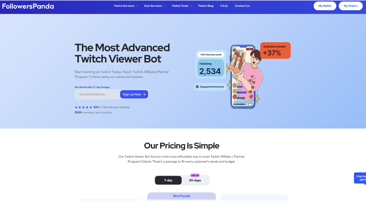 FollowersPanda.com stands out as a top choice for streamers aiming for Twitch growth as they have been around for more than 7 years. With pricing starting at $20 per week and $50 per month, its packages are designed to help you reach Twitch Affiliate Program criteria. A Monthly Twitch viewer bot package includes 20 live viewers, 15 realistic chat bots, and 700 followers in drip feed.Â